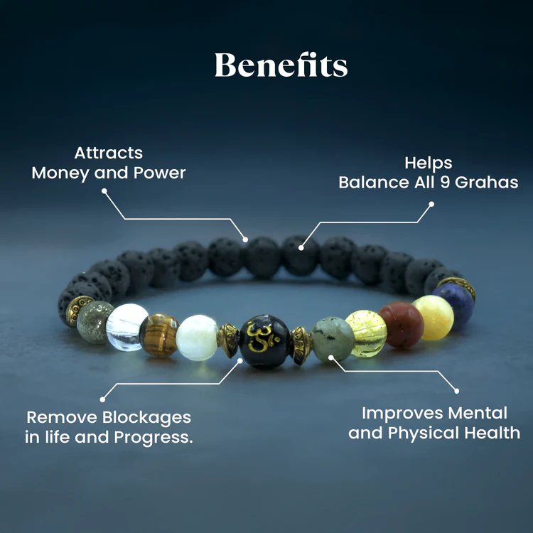 The Navagraha Shanti Bracelet is a powerful spiritual accessory designed to balance the energies of the nine planets (Navagrahas) and bring peace, prosperity, and protection into your life. Crafted with sacred stones and energised with positive vibrations, it helps harmonize planetary influences.